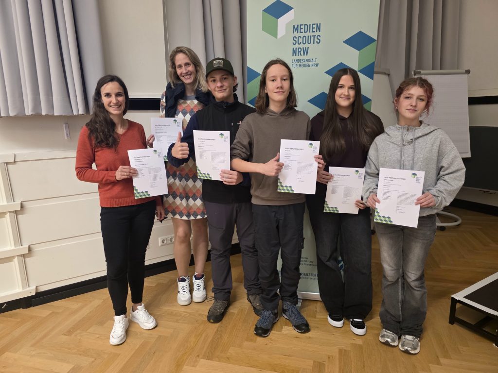 In den vergangenen Monaten nahmen vier Schüler:innen sowie zwei Lehrerinnen unserer Schule an der Ausbildung zu Medien-Scouts teil. Das Programm wird von der Landesanstalt für Medien NRW angeboten und verfolgt das Ziel, Jugendliche im verantwortungsvollen Umgang mit digitalen Medien zu stärken und sie dazu zu befähigen, ihr Wissen an Mitschüler:innen weiterzugeben.