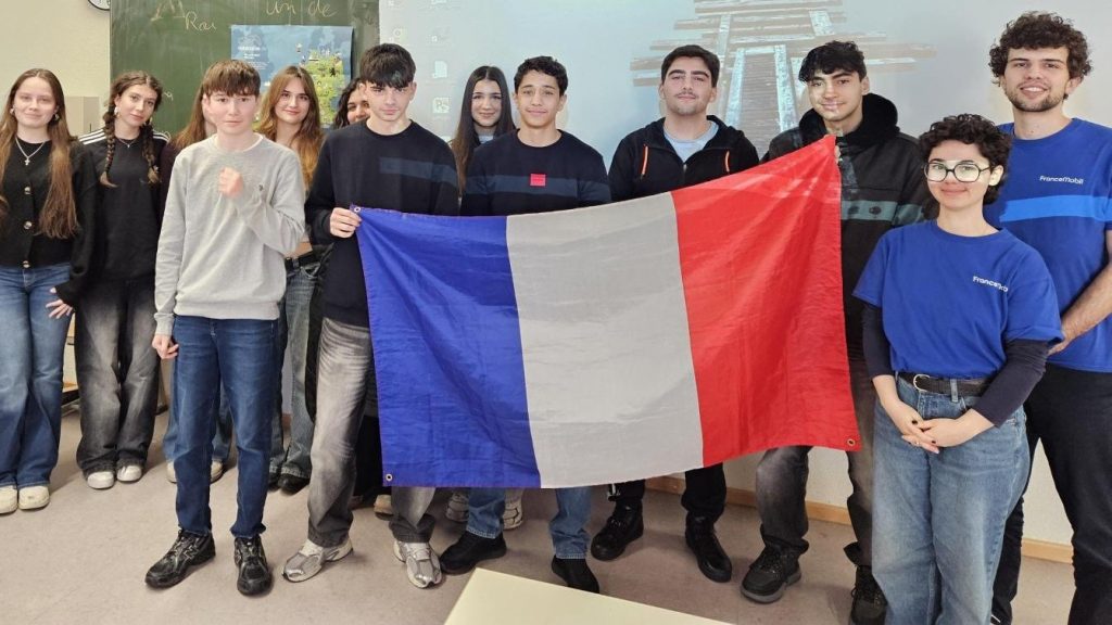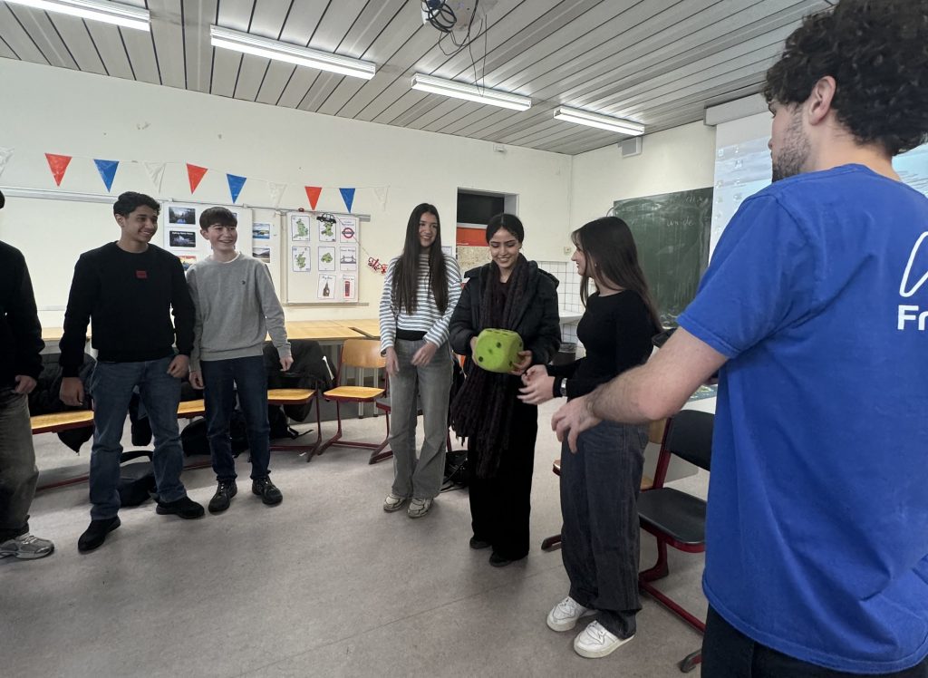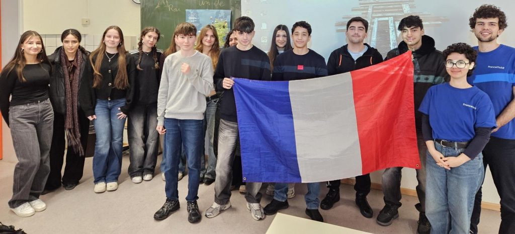 Das FranceMobil ist ein deutschlandweites Programm zur Förderung der französischen Sprache. Junge, muttersprachliche Animateurinnen und Animateure besuchen Schulen und bringen Französisch auf spielerische und lebendige Weise näher. Im Schuljahr 2025/2026 sind in Nordrhein-Westfalen unter anderem Martin Schmitt und Sarah Kroner unterwegs – die beiden leiteten auch die Aktion an unserer Schule.