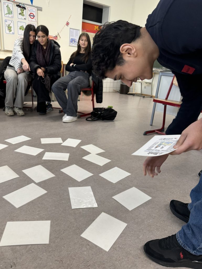 Das zweite Spiel wurde von Sarah angeleitet. Die Klasse wurde in fünf Gruppen eingeteilt, und auf dem Boden lagen Memorykarten, deren Paare jedoch nicht identisch waren. Stattdessen gehörten jeweils zwei thematisch passende Karten zusammen – zum Beispiel typische französische Speisen, Sehenswürdigkeiten oder kulturelle Symbole.