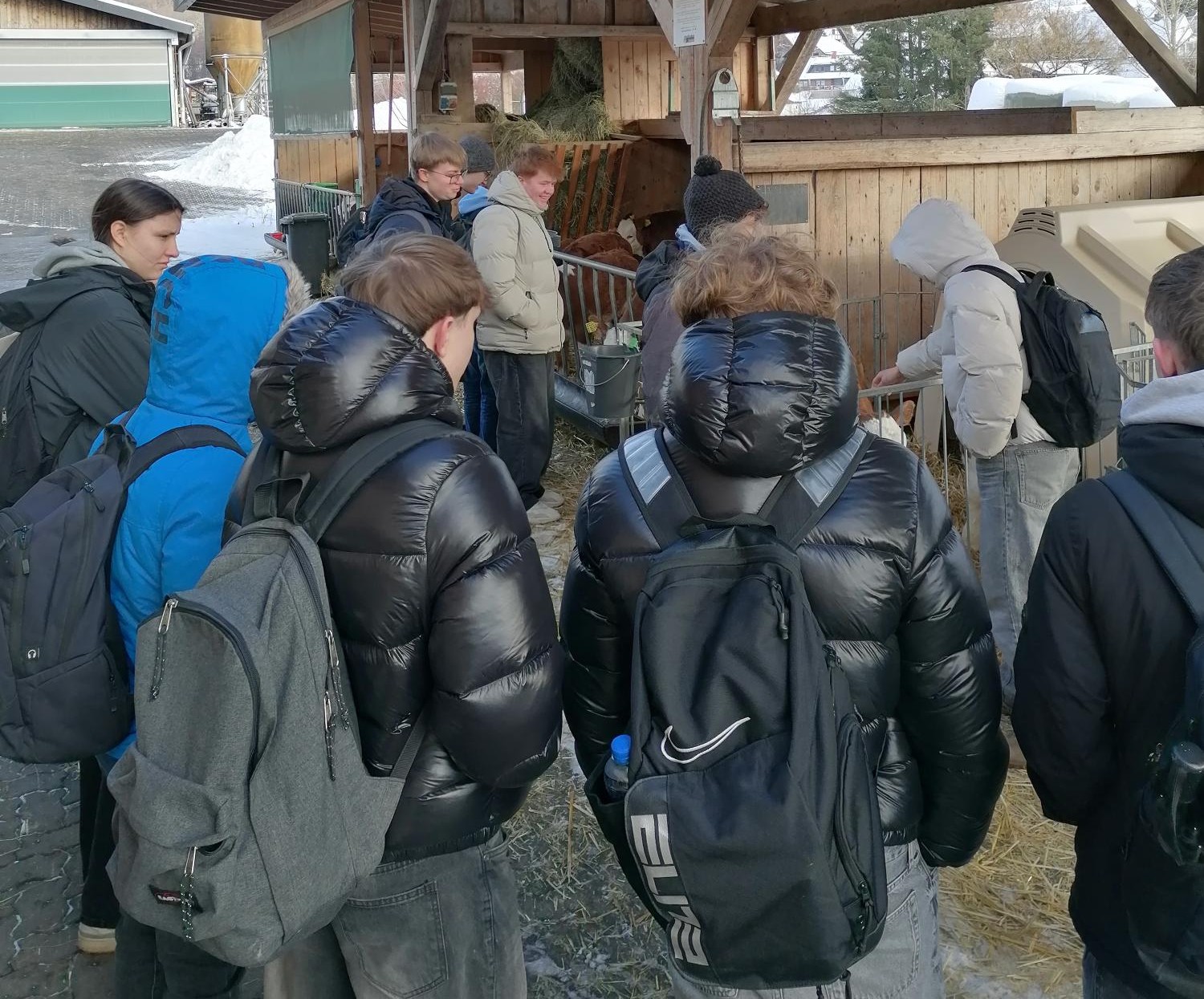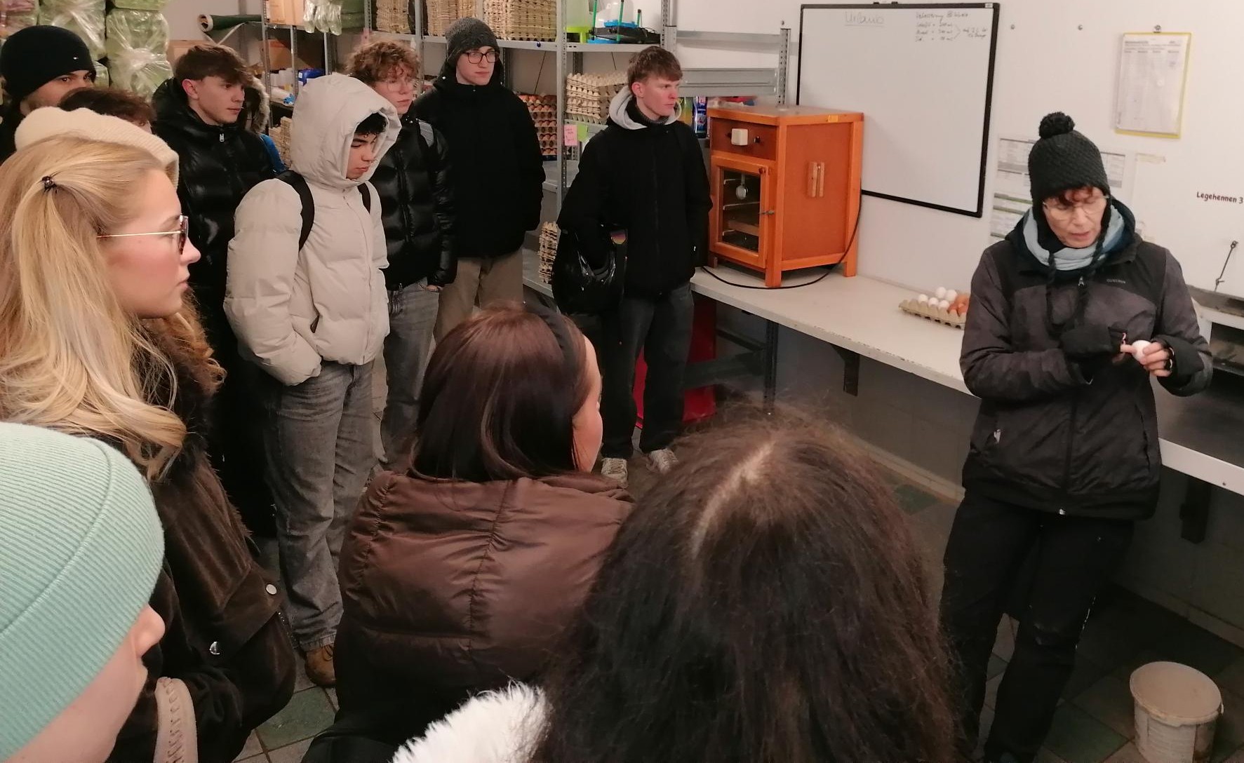 Den Abschluss der Unterrichtsreihe Strukturwandel in der Landwirtschaft der gemäßigten Zone bildete eine Exkursion zum Irlenhof für die Q1 Erdkundekurse. Zur Vorbereitung setzten sich die Schüler*innen intensiv mit Themen wie Fleischkonsum und -produktion, den Unterschieden zwischen konventioneller und ökologischer Landwirtschaft sowie der Milchviehhaltung auseinander. Vor Ort konnten sie ihr Wissen praktisch anwenden und die Nachhaltigkeit des Betriebs kritisch überprüfen. Besonders beeindruckend waren die automatisierten Arbeitsabläufe, etwa durch moderne Technik wie die Eiersortiermaschine oder den Melkroboter.