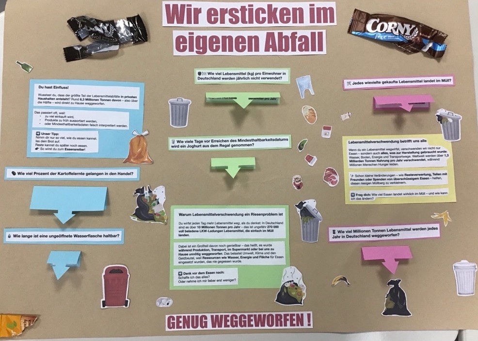 Der Erdkunde-Leistungskurs der Q1 hat sich intensiv mit den Themen Agrobusiness und dem Strukturwandel in der Landwirtschaft in verschiedenen Klimazonen auseinandergesetzt. Im Mittelpunkt stand dabei die zentrale Frage, ob und wie lange die wachsende Weltbevölkerung mit ausreichend Nahrungsmitteln versorgt werden kann. Ein besonderer Fokus lag auf der Problematik der Lebensmittelverschwendung. Nach der Auseinandersetzung mit der Dokumentation „Taste the Waste“ sowie der Überprüfung und Aktualisierung der Daten entwickelte der Kurs kreative Arbeiten, die die Ergebnisse und Erkenntnisse anschaulich und kritisch widerspiegeln.
