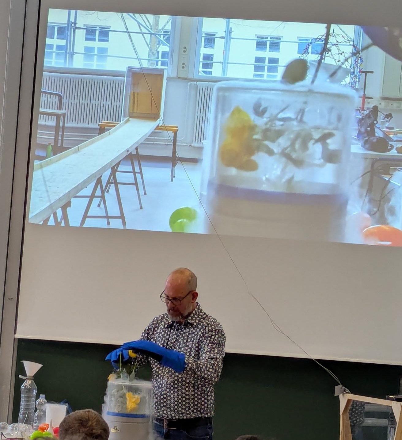 Den Abschluss des Studientags bildete eine Showvorlesung, die noch einmal eindrucksvoll zeigte, wie faszinierend Physik sein kann. Erhaltungssätze wurden dabei experimentell getestet – unter anderem mit dem Antrieb von Luft- und Wasserraketen, einer schnell rotierenden Motorradkette sowie spektakulären Experimenten bei Temperaturen von +100 Grad Celsius bis −196 Grad Celsius unter Einsatz von flüssigem Stickstoff. Mit anschaulichen Experimenten und verständlichen Erklärungen sorgte die Vorlesung für einen gelungenen Ausklang der Veranstaltung, die gegen 14:30 Uhr endete.