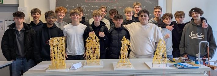 Wochen- und stundenlang hatten 18 EF-Schüler der Physikkurse in vier Teams geplant, konstruiert, verworfen, neu gedacht und sorgfältig dokumentiert – mit Motivation, Ausdauer und spürbarer Leidenschaft. Manche Kräne zerbrachen in der letzten Phase der Konstruktion, doch an Aufgeben war nicht zu denken. Mit wachsender Erfahrung, verbesserten Techniken und noch größerem Ehrgeiz entstanden sie erneut – stabiler, durchdachter, präziser. Schließlich sollte sich zeigen, welche Konstruktion der Belastung standhält.