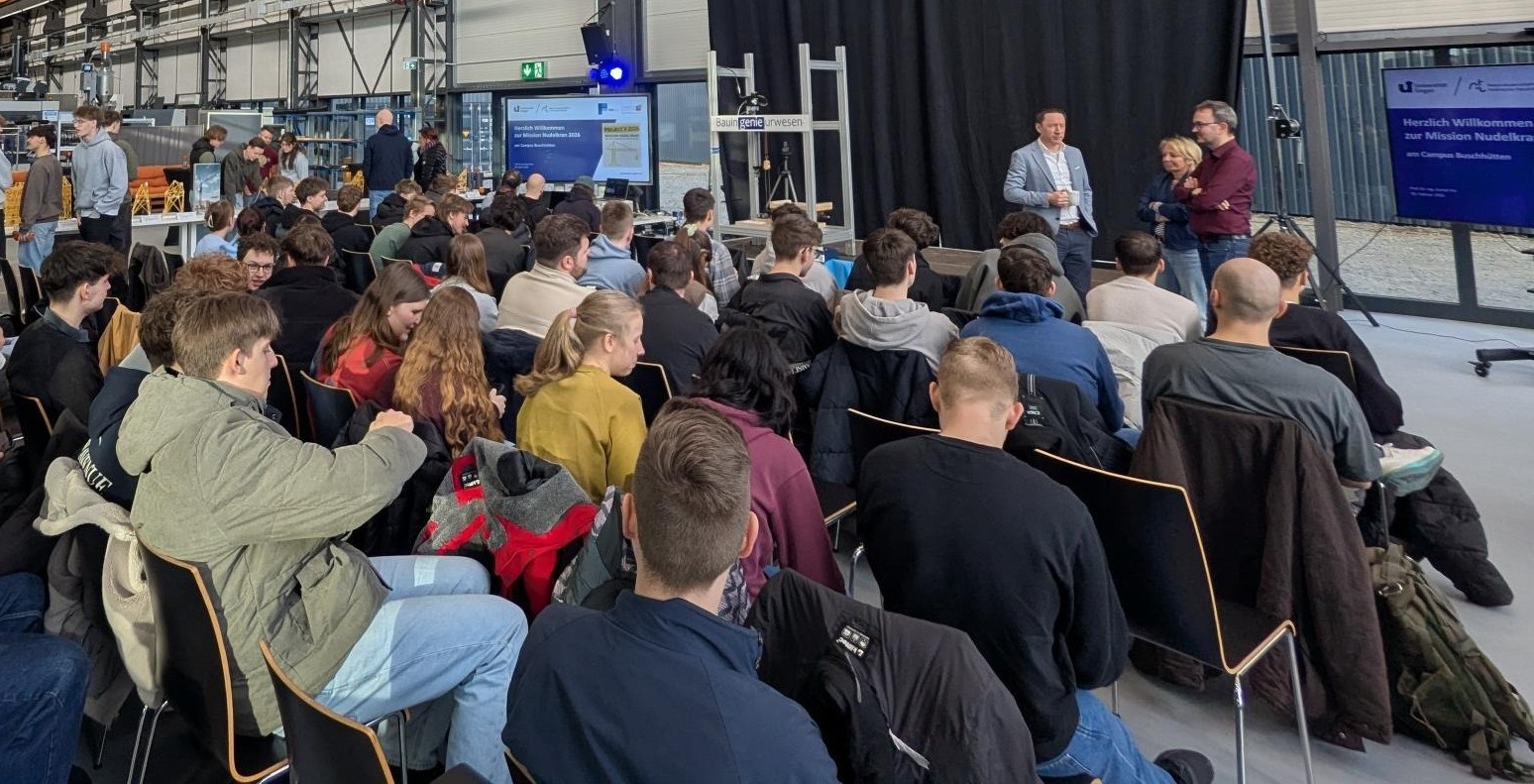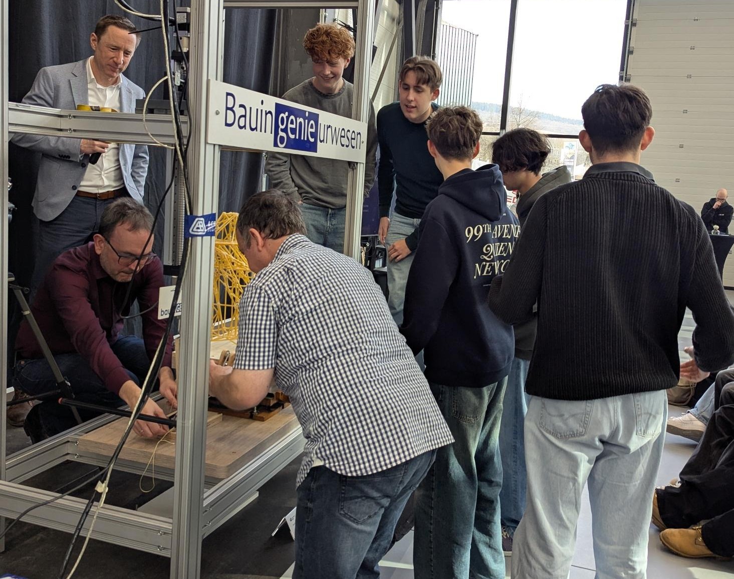 Erstmals fand die Veranstaltung in der eindrucksvollen Kulisse des Campus Buschhütten statt. Unterstützt wurde der Wettbewerb von der Achenbach Buschhütten GmbH & Co. KG, die nicht nur ihre Räumlichkeiten zur Verfügung stellte, sondern den Teilnehmenden auch Einblicke in ihre Ausbildungswerkstatt gewährte. Die hohe Werkstatthalle beeindruckte durch ihre festliche Atmosphäre ebenso wie durch ihre Authentizität. Während die Wettbewerbsmodelle geprüft wurden, liefen im Hintergrund große Maschinen – ein eindrucksvolles Zusammenspiel von Theorie und realer Ingenieurpraxis.